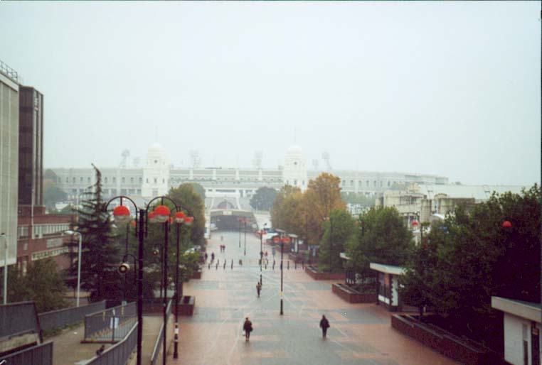 Das legendäre Wembley-Stadion kurz vor seinem Abriss im Oktober 2000. Der zentrale Zugang (oben links), einer der beiden berühmten