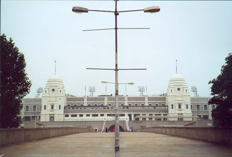 Seitenstrasse, rechts der Haupteingang und die Westtribüne).